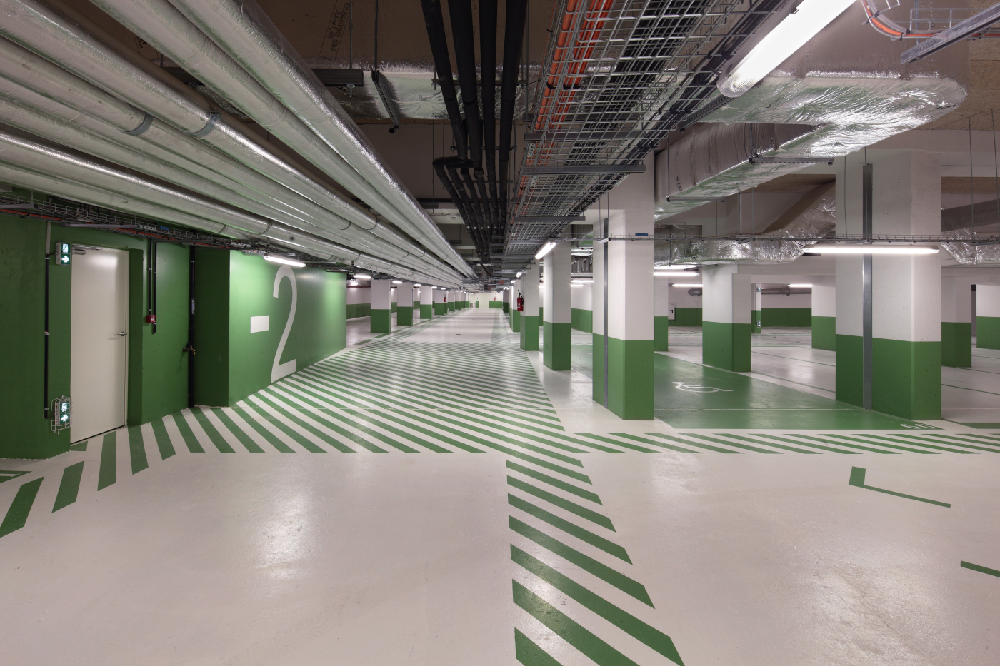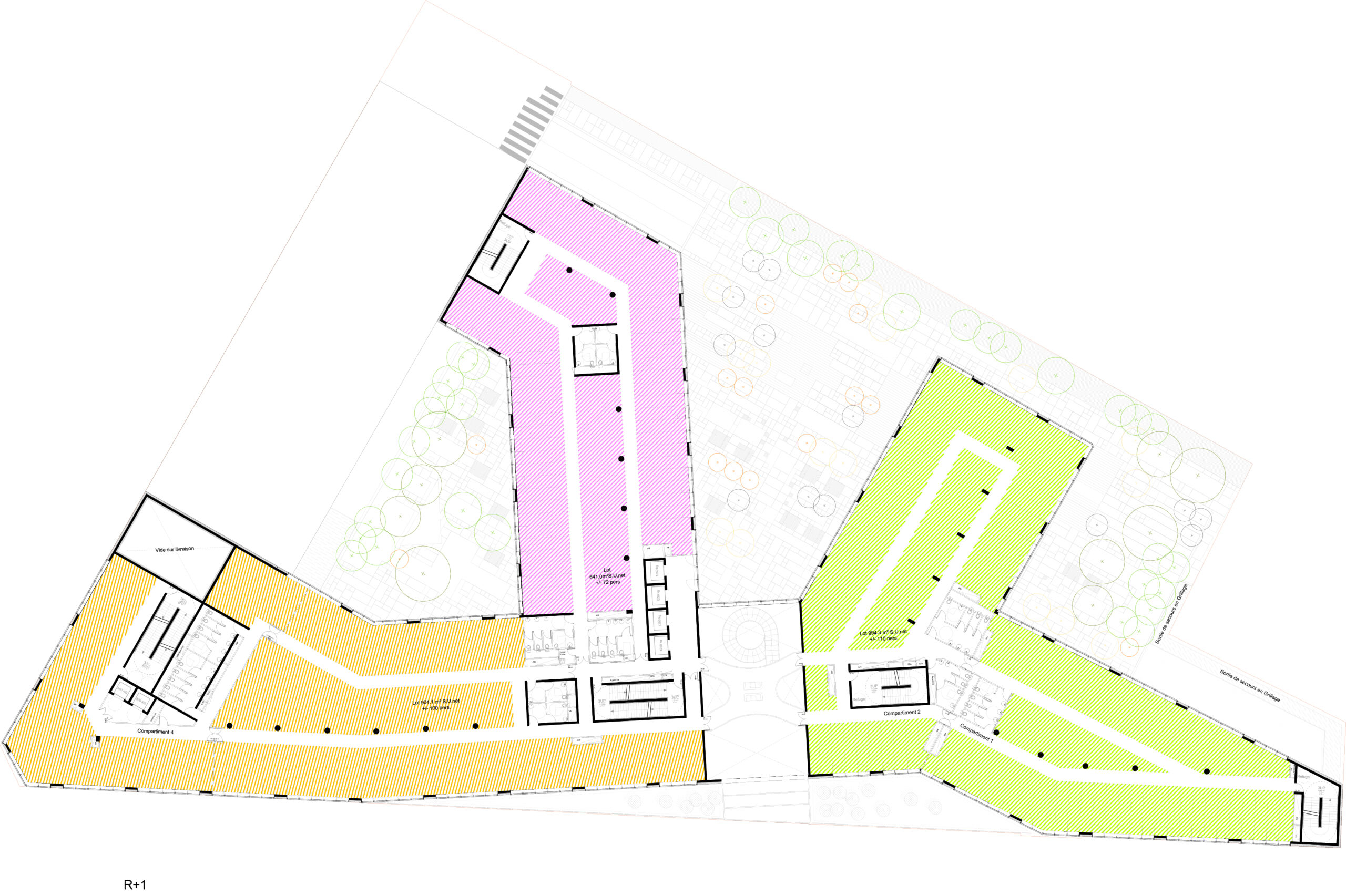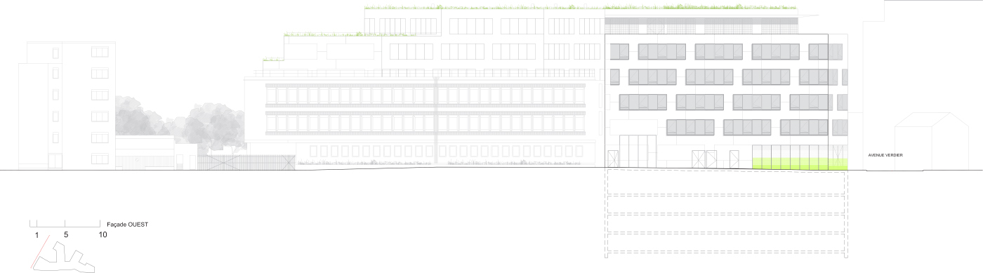Imaginé comme une masse blanche sertie dans un écrin végétal, le projet s’installe dans le bâti de Montrouge. Le corps du bâtiment est intégralement développé sur tout le linéaire de l’avenue Verdier et l’avenue de la Marne, proposant de grands plateaux offrant de vastes surfaces d’échanges de plain-pied, tout en restant dans des standards d’habitabilité et de sécabilité actuels. La volumétrie générale du bâtiment s’inscrit dans une composition architecturale très classique avec un socle, un corps de bâtiment et un attique. Proposant de faire flotter le volume au-dessus de l’espace vert, le rapport au sol est pensé pour générer de la légèreté. Le socle s’estompe au profit du végétal. Un retrait avenue Verdier marque l’accueil au centre du bâtiment : un hall ouvert sur le cœur d’ilot, cadré par une batterie d’ascenseurs desservant tous les plateaux. Le hall d’entrée met en relation la rue et un cœur d’ilot protégé, intime, un jardin paysagé imbriqué dans les volumes des bureaux. La volumétrie de cet espace de travail est simple, rationnelle avec une démultiplication de larges terrasses ouvertes sur un paysage de premier plan du sud parisien. Les espaces de restauration et de cafétéria sont compris entre une mitoyenneté et un vaste espace paysagé. Le restaurant très transparent s’ouvre sur le rez-de-jardin, serti dans le végétal. On déjeune dans le jardin, les plantes génèrent mouvement et intimité.