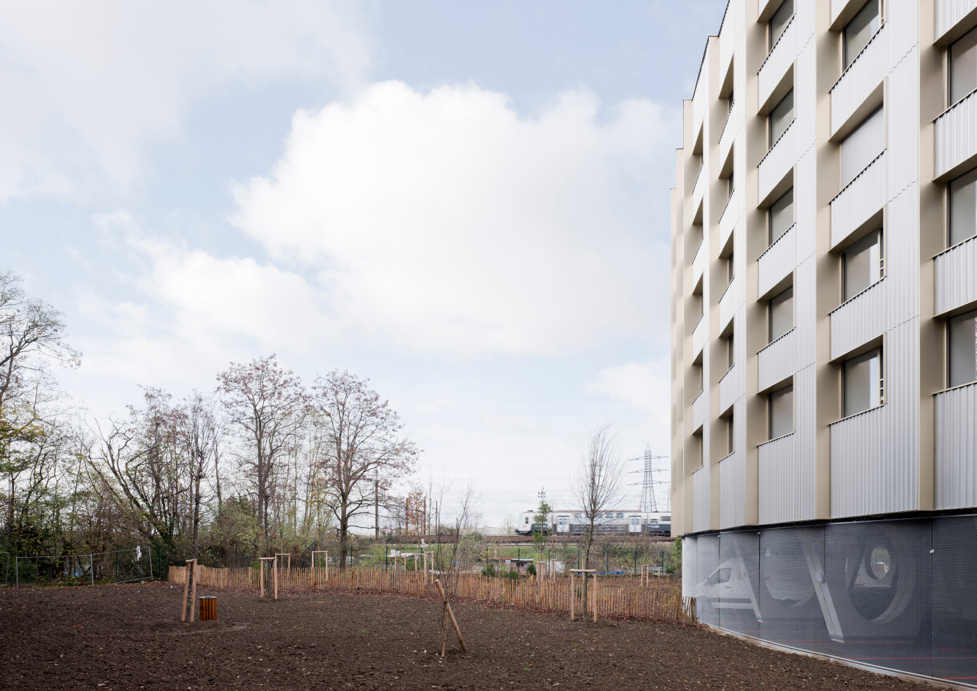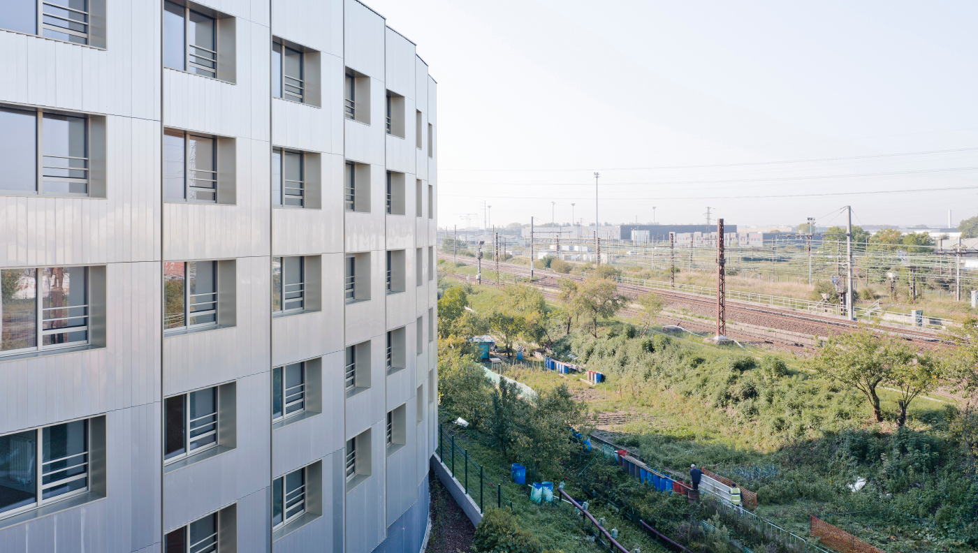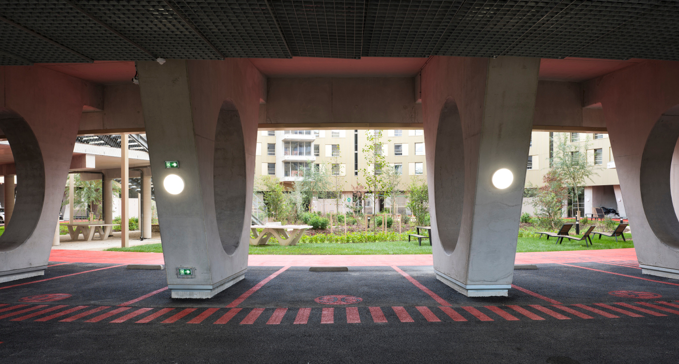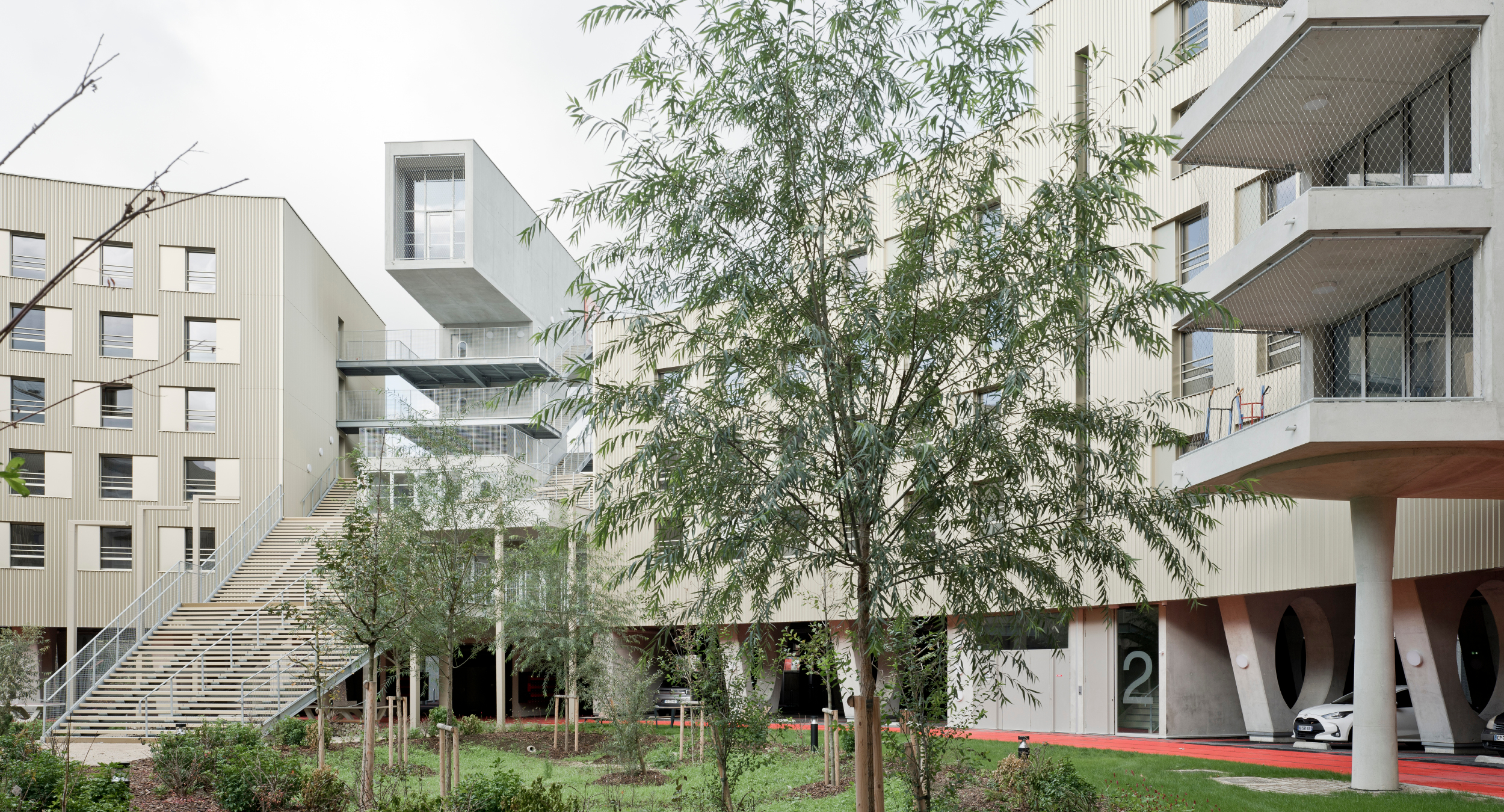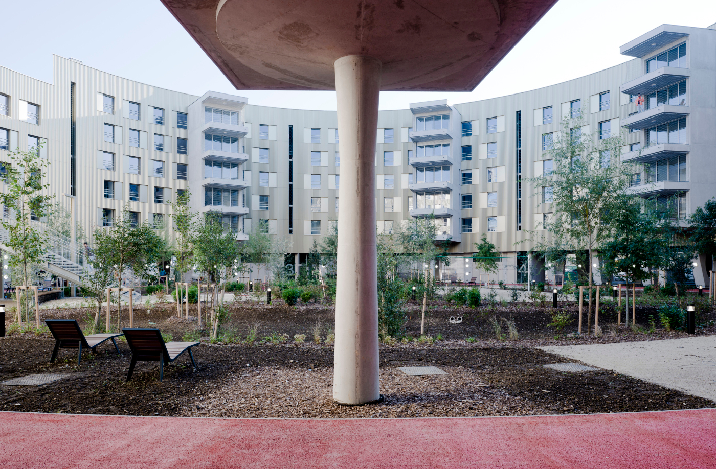 Équipe : 2R Ingénierie (Structure) / Scoping (Fluides, Économie, Synthèse) / Socotec (AMO HQE) / Quatorze Ingénierie (Thermique) / Lasa (Acoustique) / EVA (VRD) / Mugo (Paysage) / Legendre (Entreprise générale de la résidence étudiante)