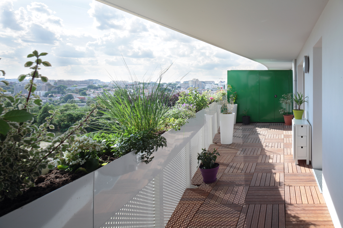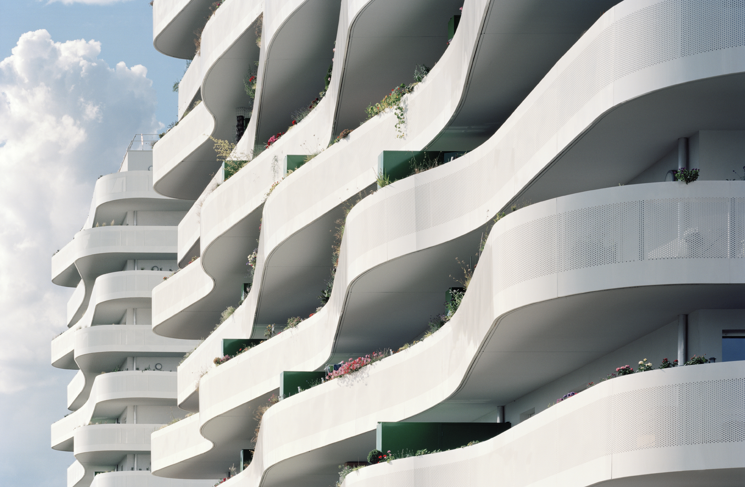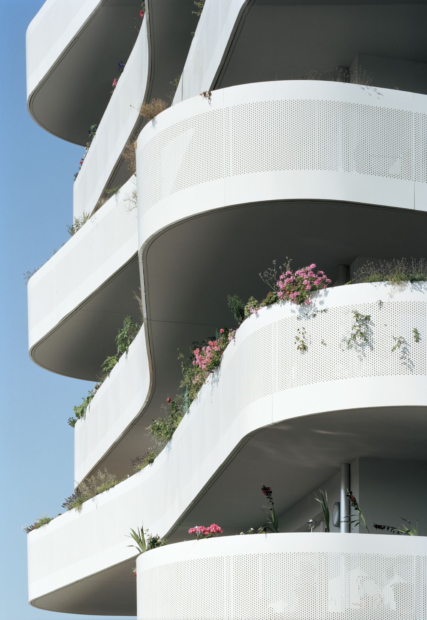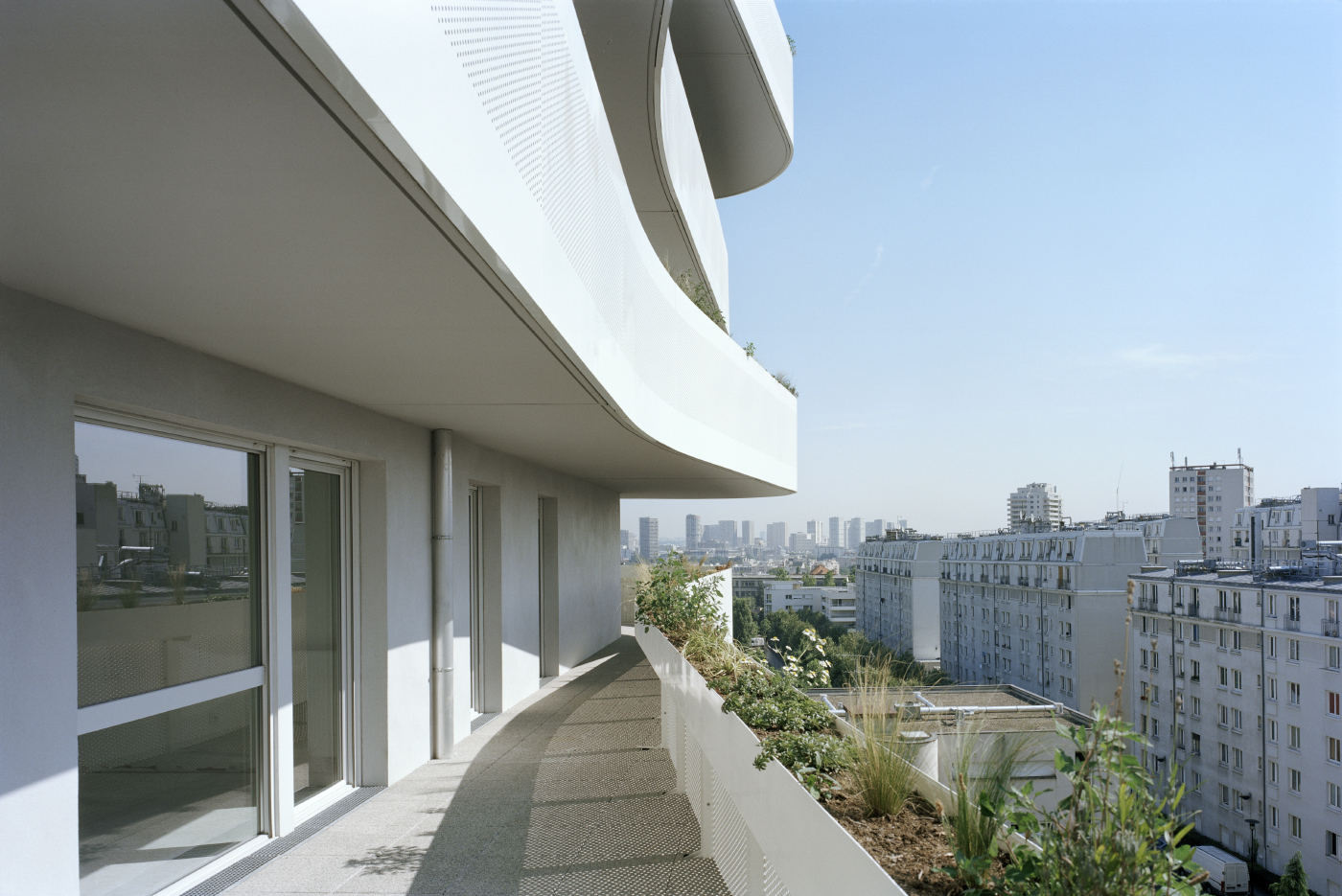 Offrir à 100 % des logements une large surface extérieure avec une pièce principale systématiquement positionnée pour bénéficier du meilleur ensoleillement, de la meilleure vue et de la plus grande intimité. Chaque logement est prolongé sur l’extérieur par des balcons de 30 m² en moyenne pour un 3 pièces de 60 m². Ces espaces extérieurs généreux, véritables pièces à vivre permettent de démultiplier les surfaces privatives, dans une recherche d’harmonie entre un univers urbain et son environnement. Il s’agit là d’un luxe premier et qui constitue en tant que telles les façades.