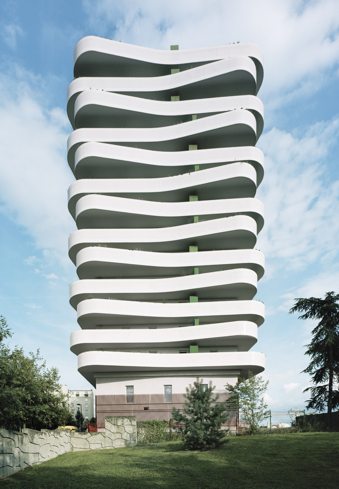 La façade est donc l’expression d’un lieu de vie dont les mouvements en sinusoïdes alternées sont réalisés pour permettre un très bon ensoleillement malgré des porte-à-faux allant jusqu’à 3.20 m de profondeur. Ainsi, devant chaque séjour le balcon est d’une amplitude maximale pour s’affiner devant les chambres ou pièces secondaires. Les logements sont alternés niveau par niveau afin de ne jamais superposer les séjours. Ainsi malgré les dimensions très généreuses des balcons, il n’y a pas d’effet de masque entre logements.